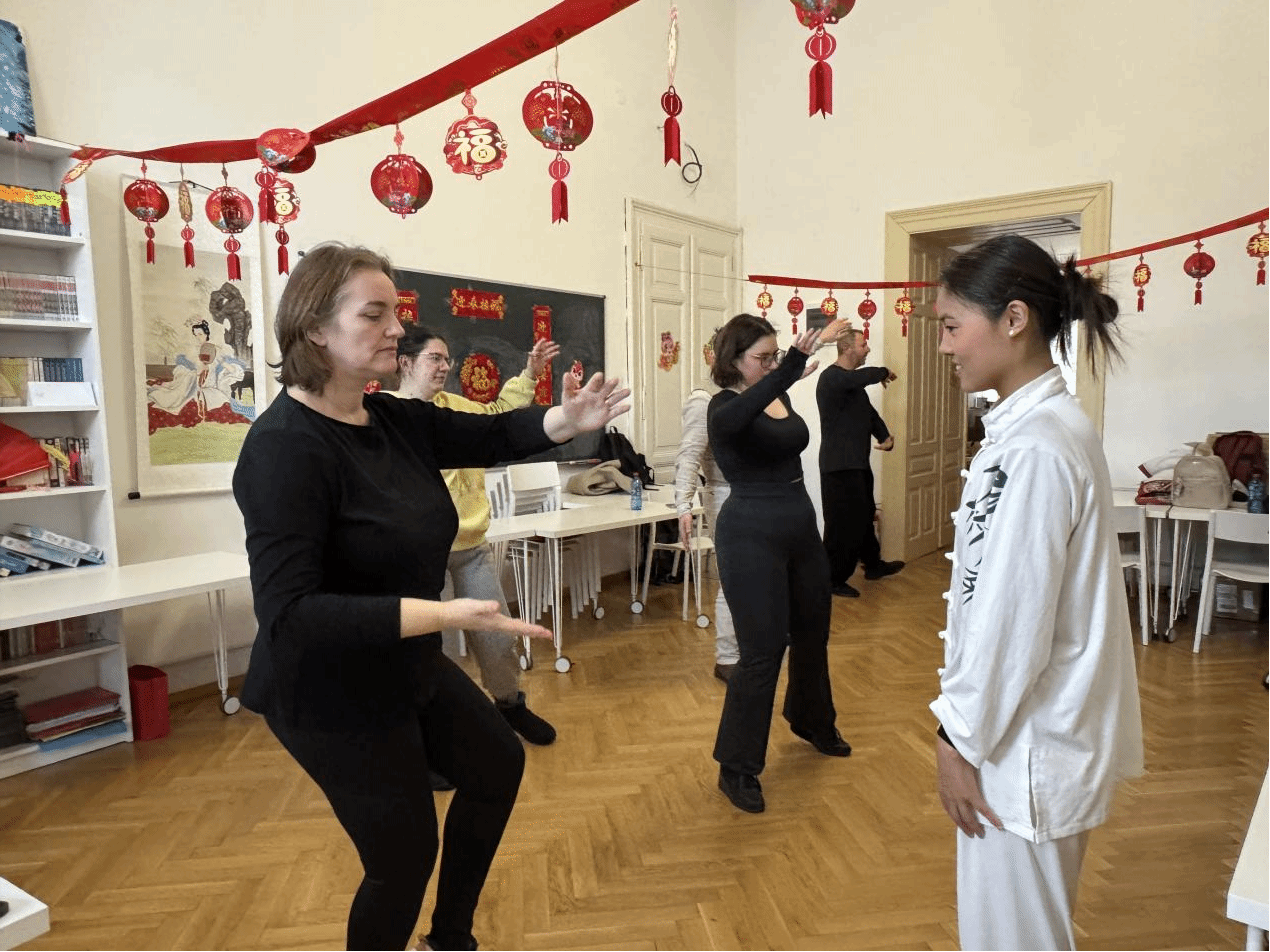 为深化“中文+文化”教学实践、丰富国际中文教育内涵,近日,我校特来西瓦尼亚大学孔子学院正式开设太极与书法公益文化课程,以理论与实践相结合的教学模式,为当地民众打开了了解中国优秀传统文化的新窗口。太极课程由志愿者教师代雨欣负责授课。课程以十六式简化太极拳为主线,从起势、野马分鬃到云手、单鞭,系统引导学生体验太极的基本动作与文化内涵。代雨欣老师在教授动作要领、步伐转换与呼吸节奏的同时,深入讲解太极蕴含的“阴阳相济”“以柔克刚”等哲学理念。为帮助学生突破语言与动作理解的障碍,她创新运用“分段视频预习法”,将动作拆解录制并提前发送,显著提升了学习效率。课堂上,学生们在舒缓的音乐中静心练习,真实感受到“动静结合、内外兼修”的东方智慧。不少学生表示,太极不仅提升了身体协调性,更带来身心的放松与专注。