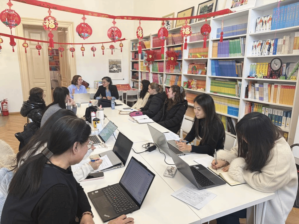 为进一步深化中罗教育合作,服务本土中文教育高质量发展,2026年2月27日,我校孔子学院教学团队受邀走进布拉索夫特来西瓦尼亚大学中文专业课堂,参与汉语教学法课程建设与教学实践交流。孔子学院中方院长王冰及5名教师围绕课程内容优化、教学方法创新与实践能力培养等方面,与约安娜·埃内斯库(Ioana Enescu)教授及中文系5名大二学生展开深入研讨,将孔院一线中文教学经验有机融入本土专业课程体系,切实助力汉语教学法课程提质增效。